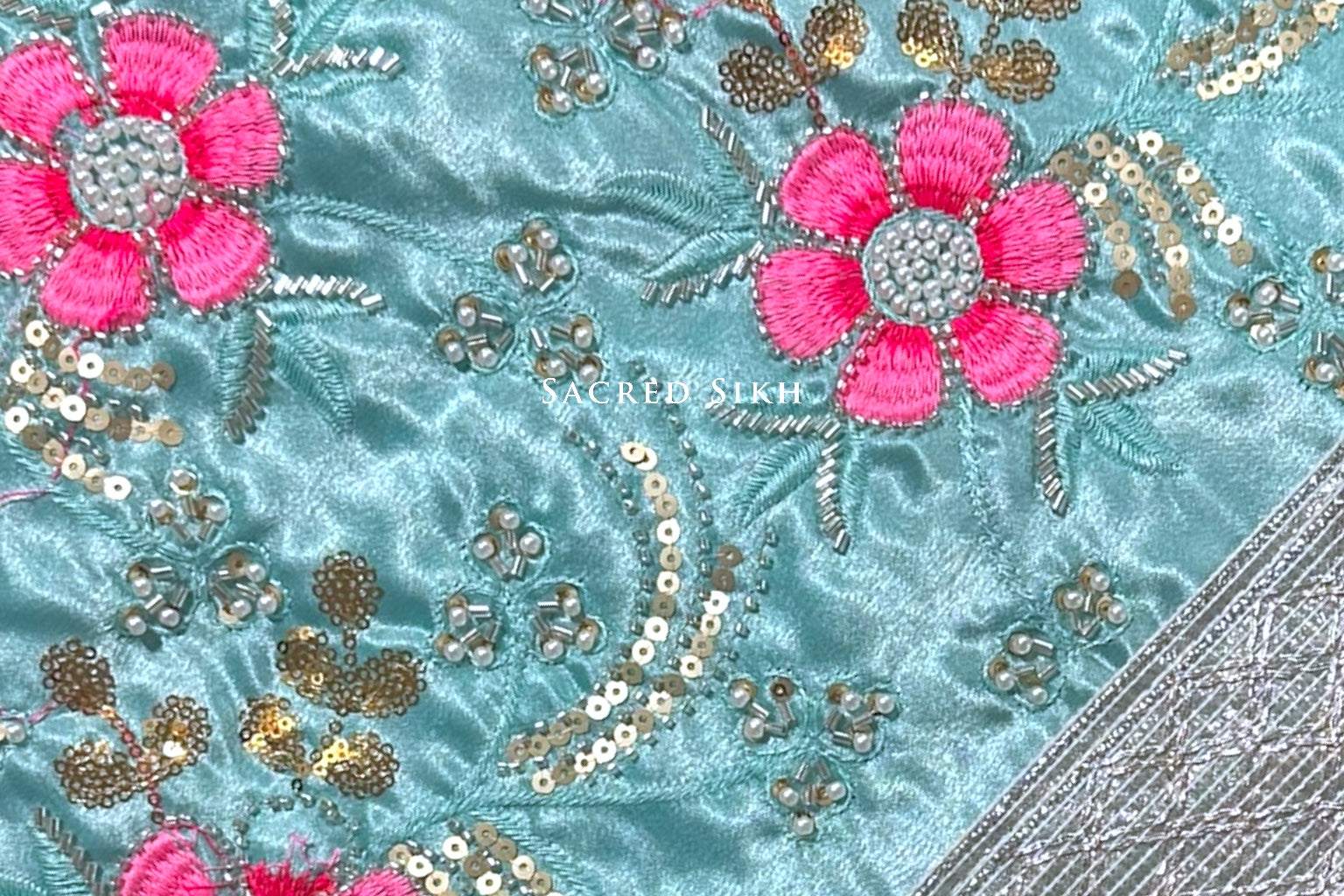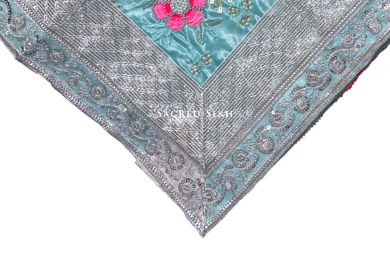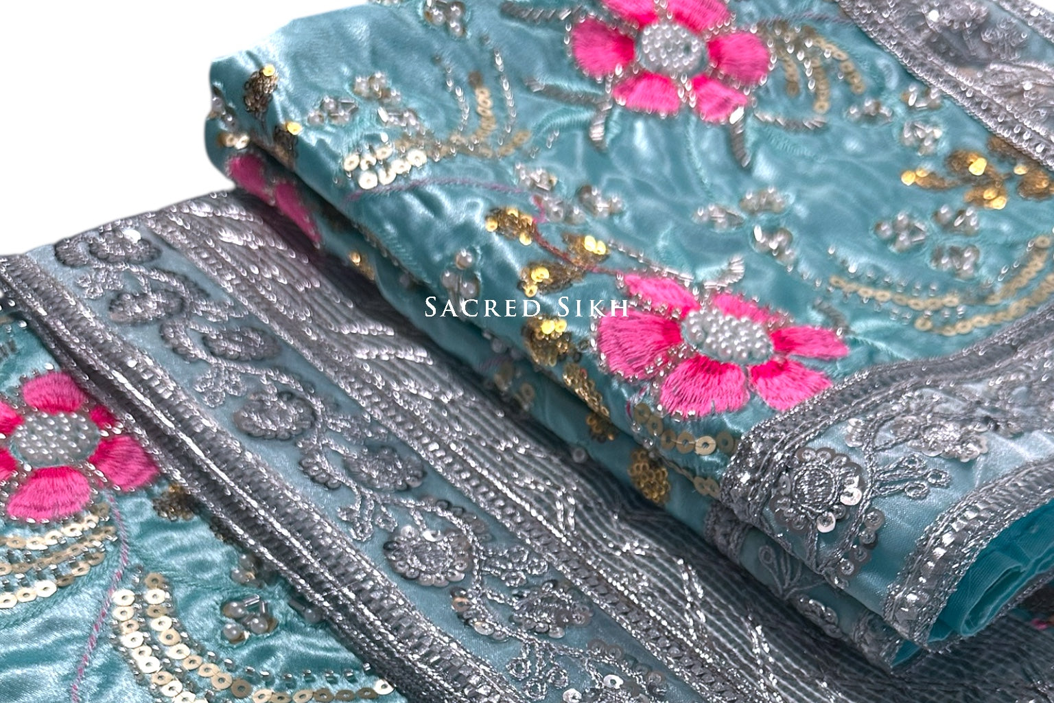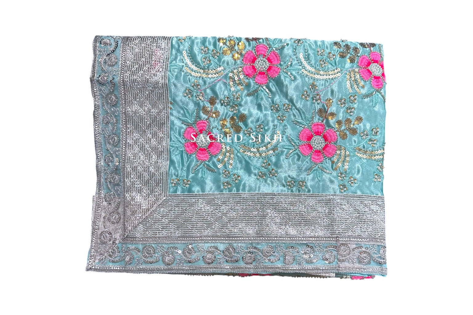 A stunning pastel range of rumalla sahibs. Embroidered with a pearl effect and a stunning silver net trim. A beautiful piece.