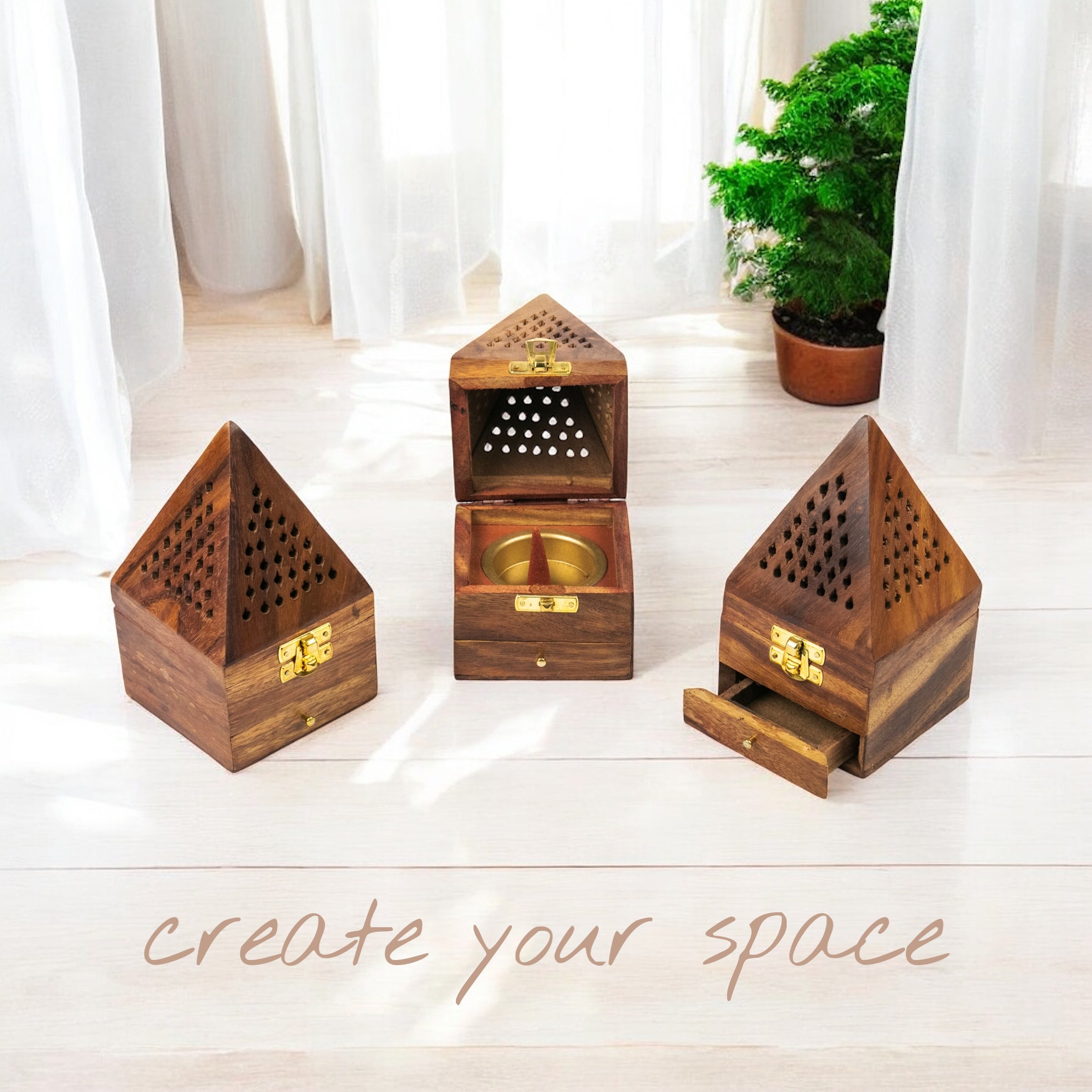 A beautifully, crafted wooden incense holder. Its pyramid shape makes it a wonderful ornamental piece, with the patterned cut work holes making it easy for the smell of the incense to emanate throughout your home or work space.