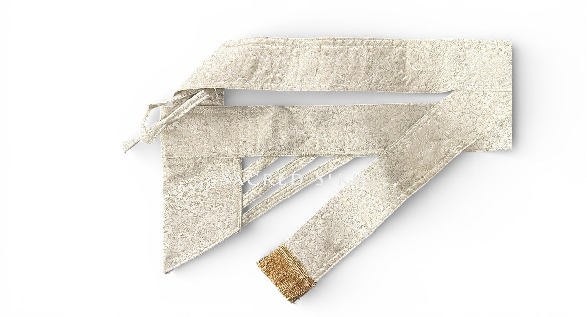 This beautiful, elegant gatra is truly unique. Adorned with a frill at the front of the gatra and a simple fabric tie to keep your thalvar in place. A truly exquisite gatra.